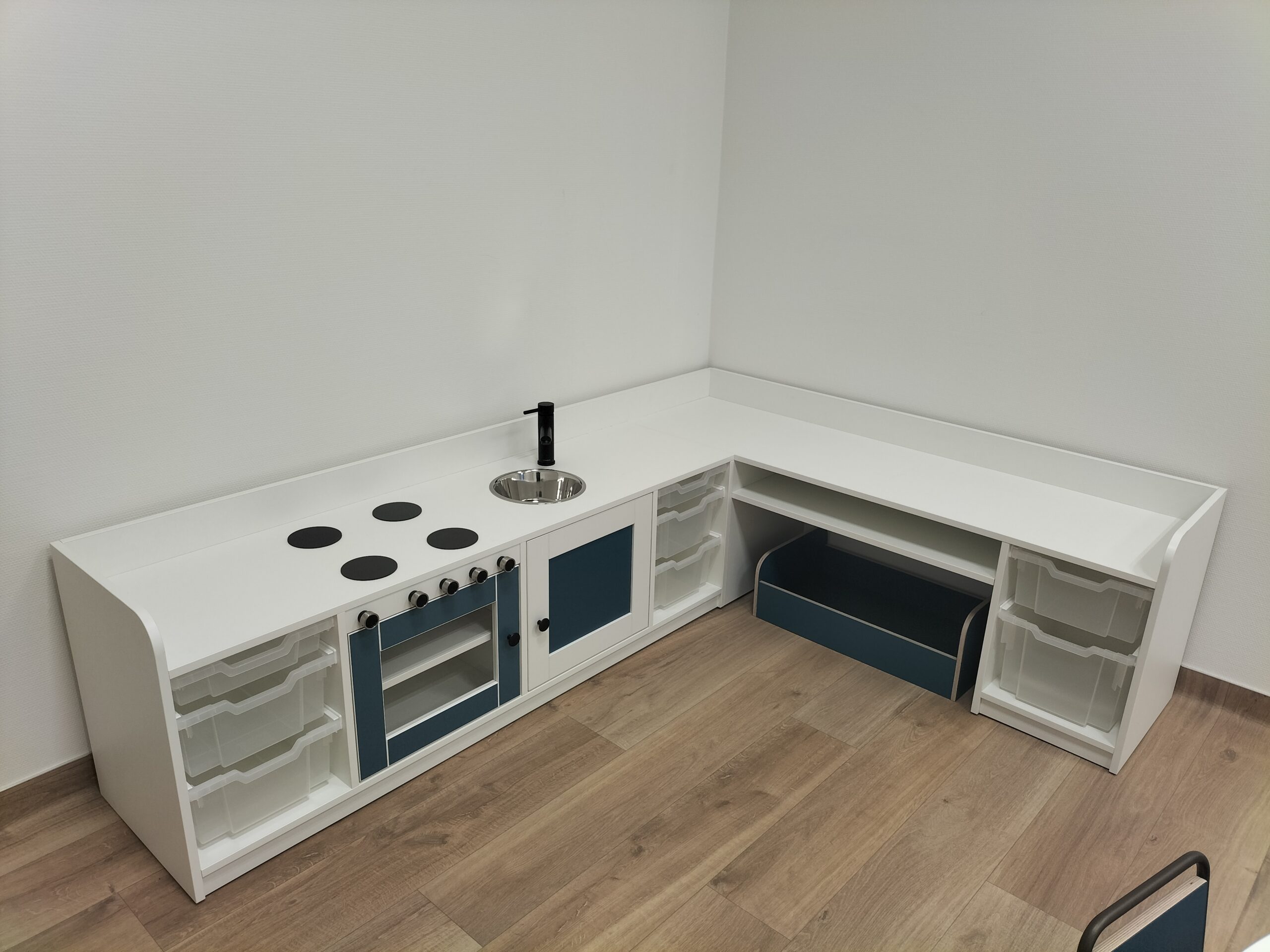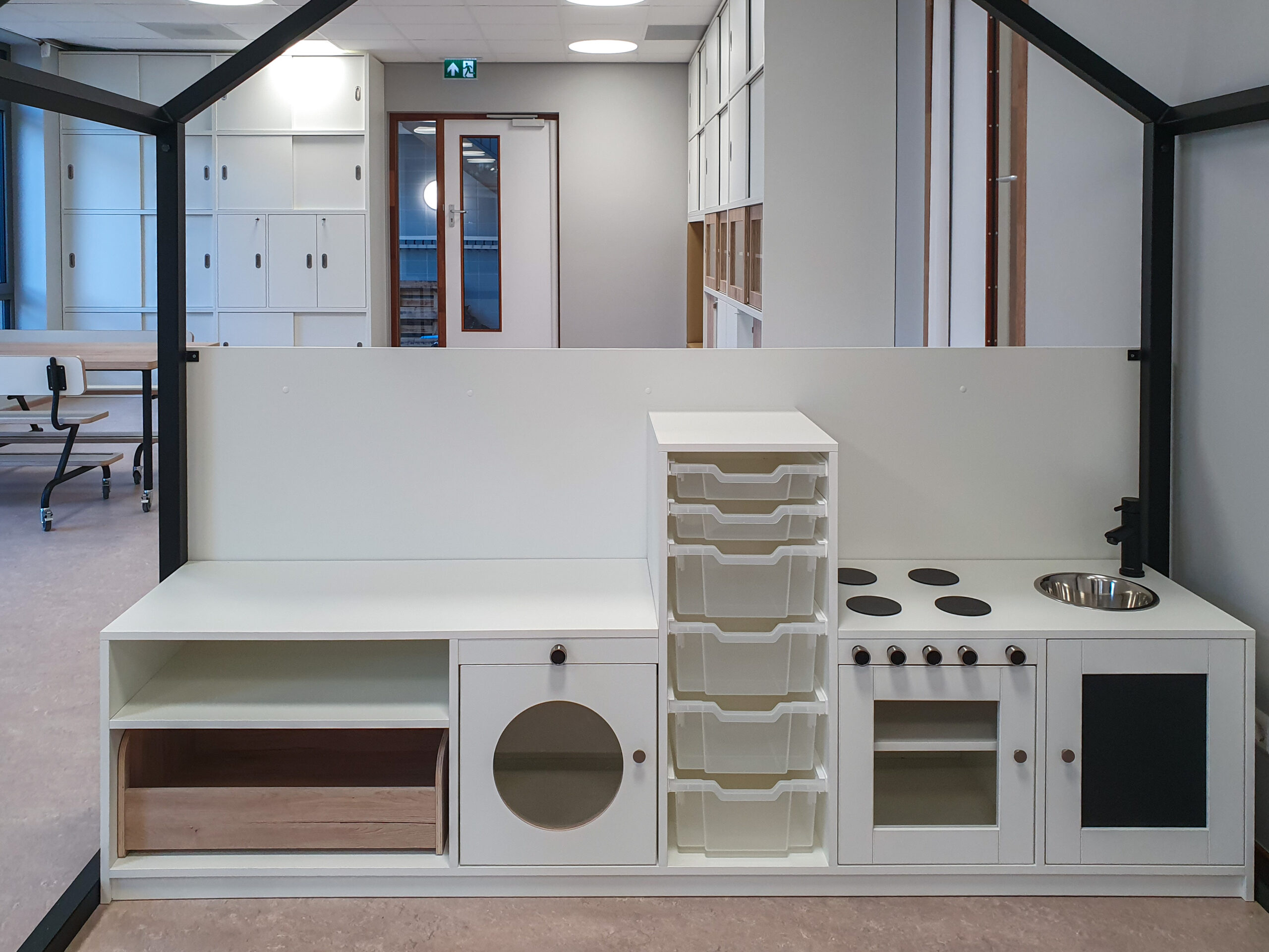 Cooky is een leuk speelmeubel voorzien van een keukenblok met wasbak en kraan, oven, wasmachine en extra opbergmogelijkheden. Cooky wordt standaard geleverd op plint, maar indien gewenst is het ook mogelijk om deze op wielen te leveren. Andere samenstellingen kunnen in overleg worden gerealiseerd.