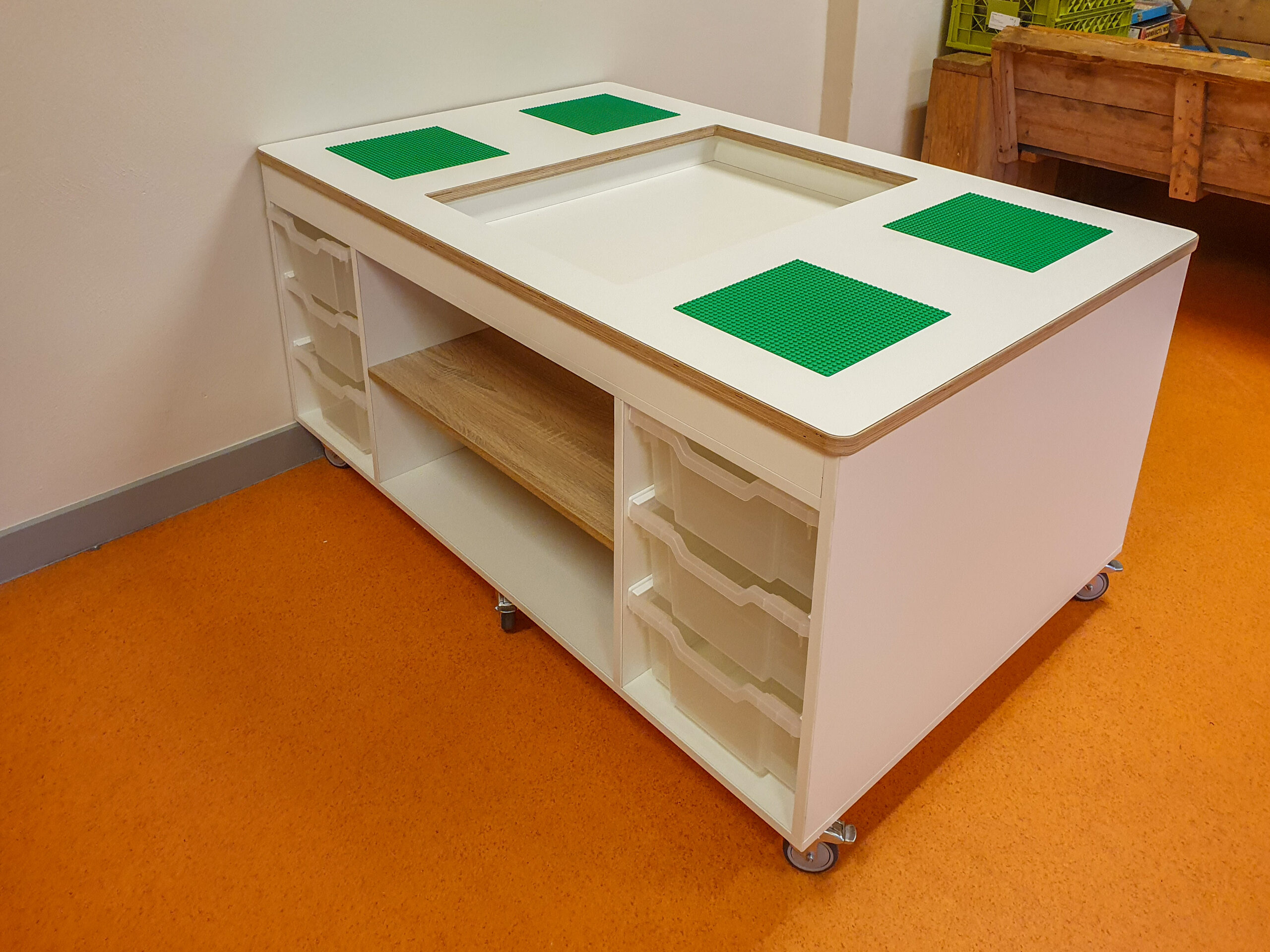 – 140x90x70 cm , met 4 lego- of duploplaten en 2 vakken voor bouwblokjes