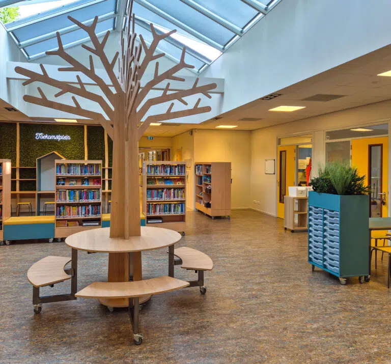 Voor deze school mochten wij de aula met bibliotheek en kleutergang inrichten waarin spel, rust en ontdekking samenkomen. De aula