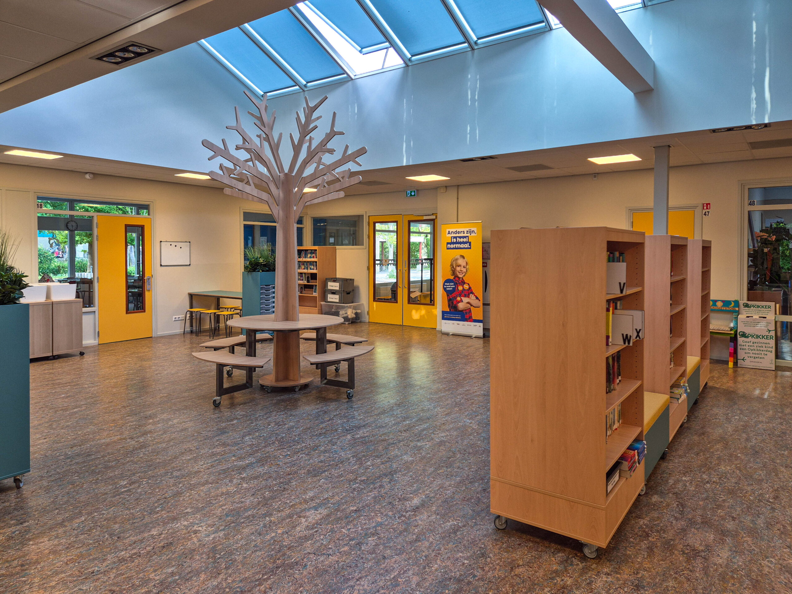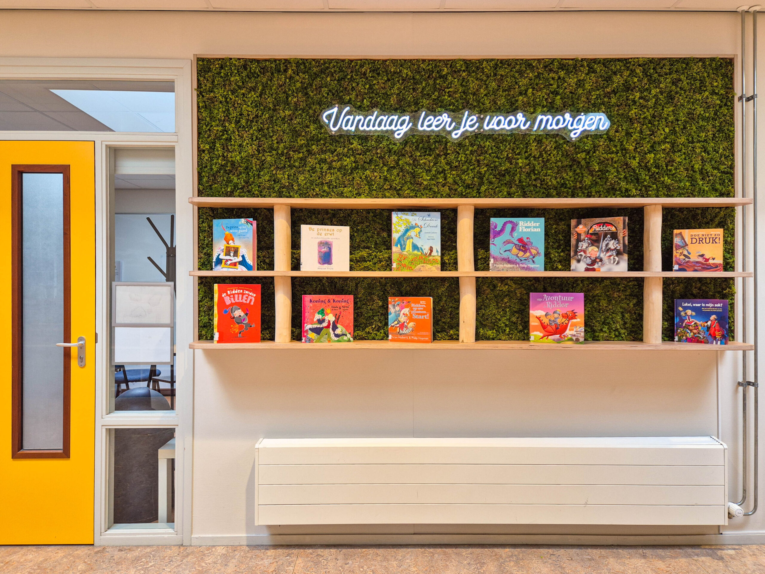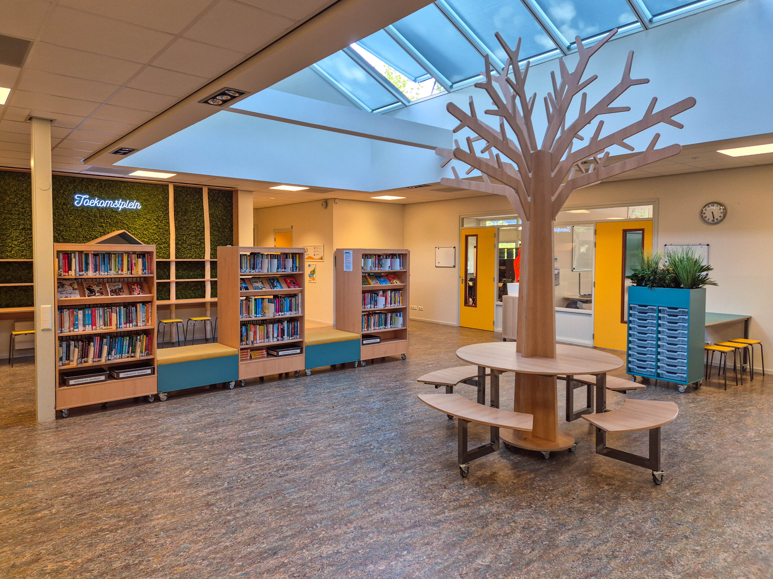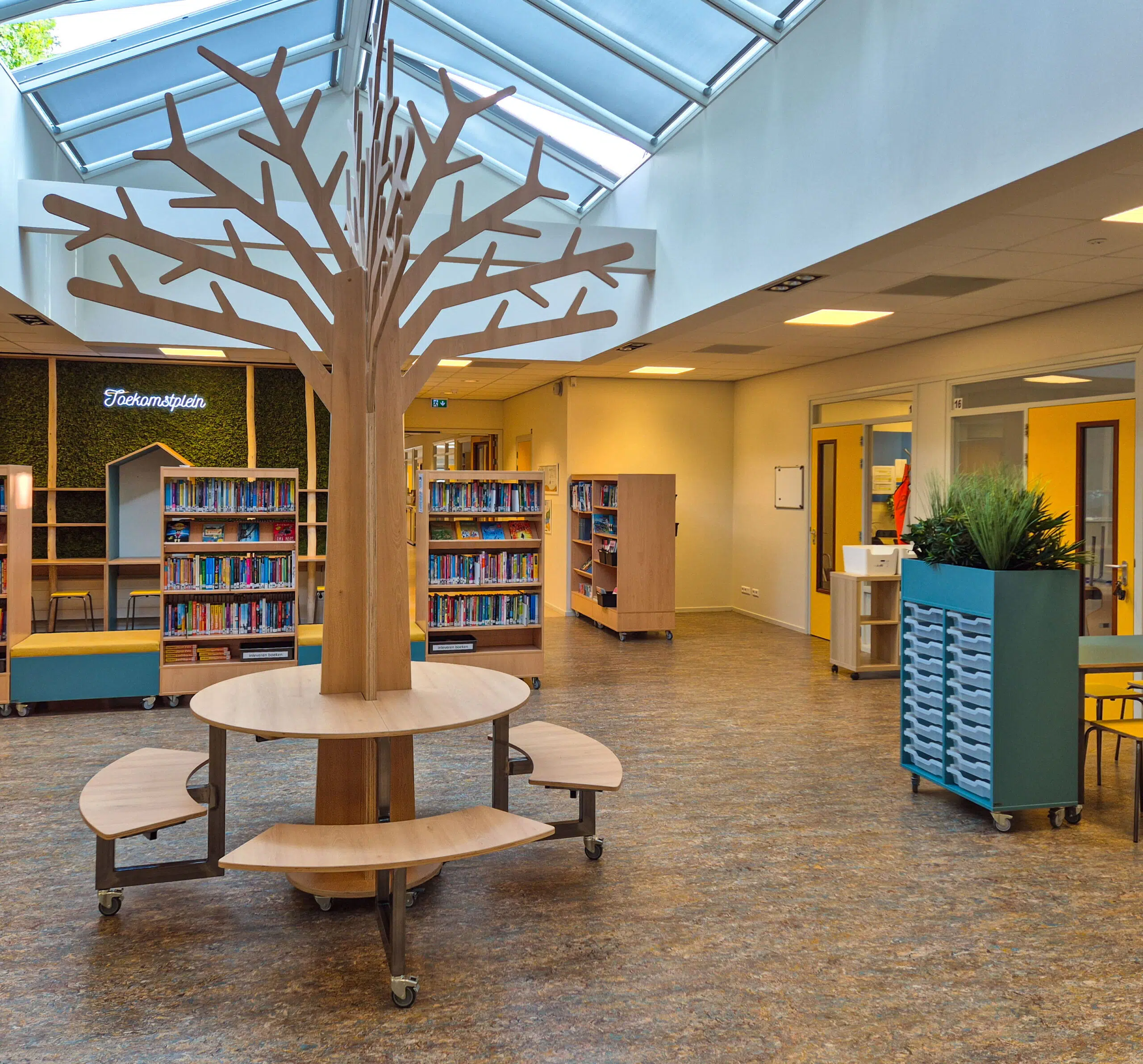 Voor deze school mochten wij de aula met bibliotheek en kleutergang inrichten waarin spel, rust en ontdekking samenkomen. De aula met onder andere een opvallende moswand en speels neonlicht, met planken gemaakt van geschaafde boomstammen die de natuur naar binnen brengen. Leerlingen kunnen samenkomen bij de grote houten boom met picknicktafel, of juist een eigen plek zoeken in een van de stiltehuisjes. Het leerplein is verder verrijkt met boekenkasten en hockers op wielen, waardoor leerlingen flexibel kunnen lezen, werken en ontspannen.