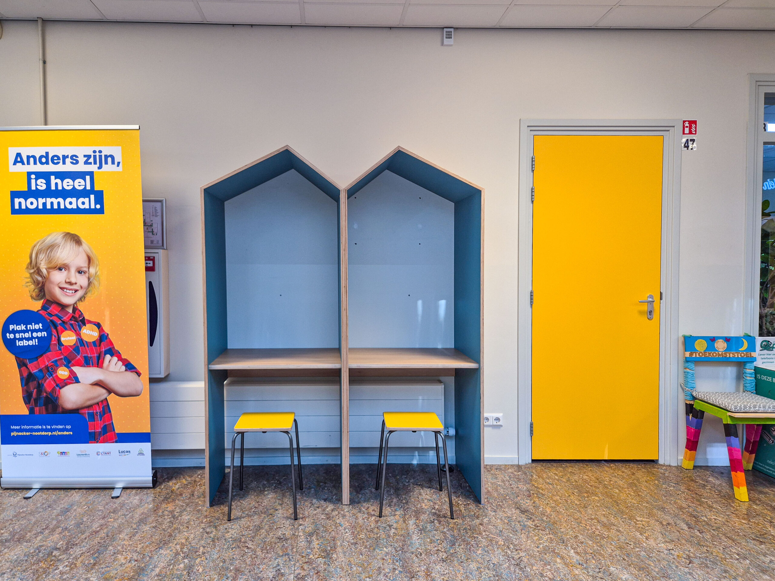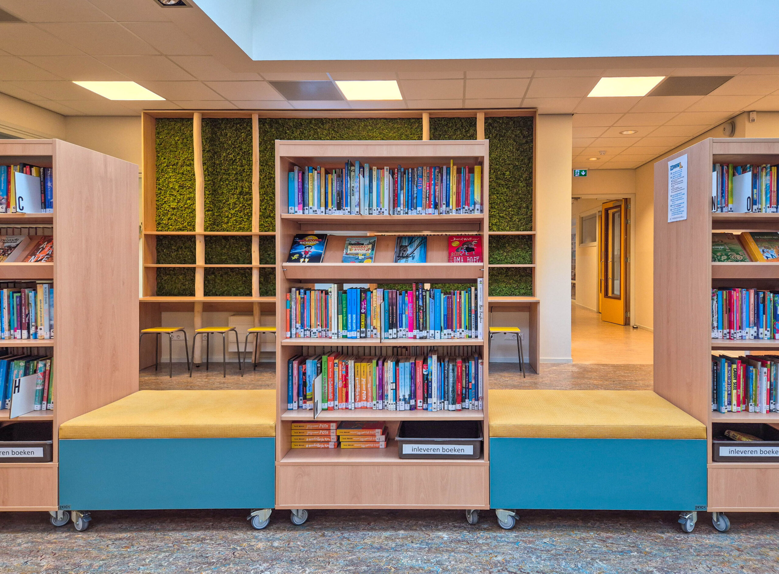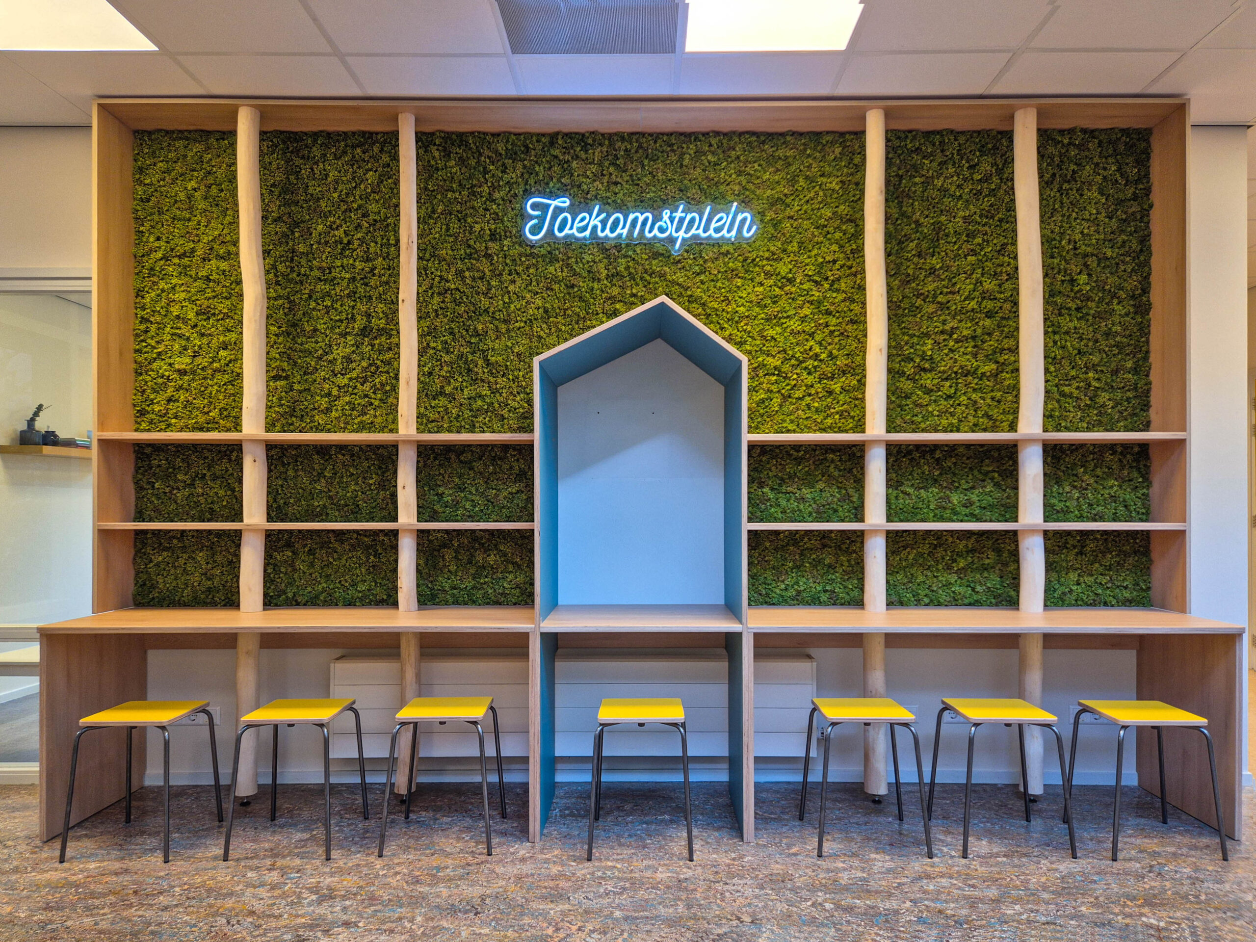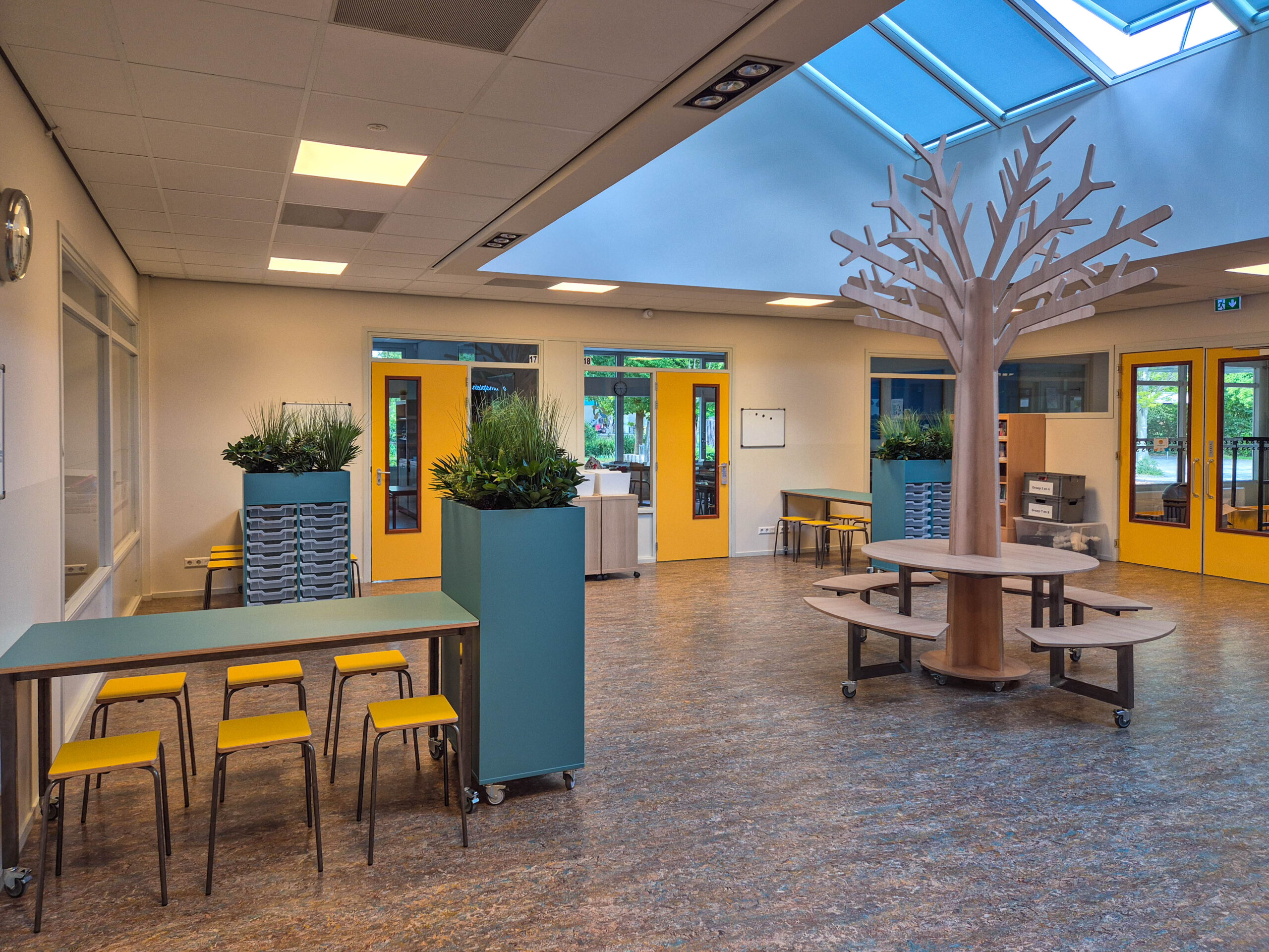 Voor deze school mochten wij de aula met bibliotheek en kleutergang inrichten waarin spel, rust en ontdekking samenkomen. De aula met onder andere een opvallende moswand en speels neonlicht, met planken gemaakt van geschaafde boomstammen die de natuur naar binnen brengen. Leerlingen kunnen samenkomen bij de grote houten boom met picknicktafel, of juist een eigen plek zoeken in een van de stiltehuisjes. Het leerplein is verder verrijkt met boekenkasten en hockers op wielen, waardoor leerlingen flexibel kunnen lezen, werken en ontspannen.