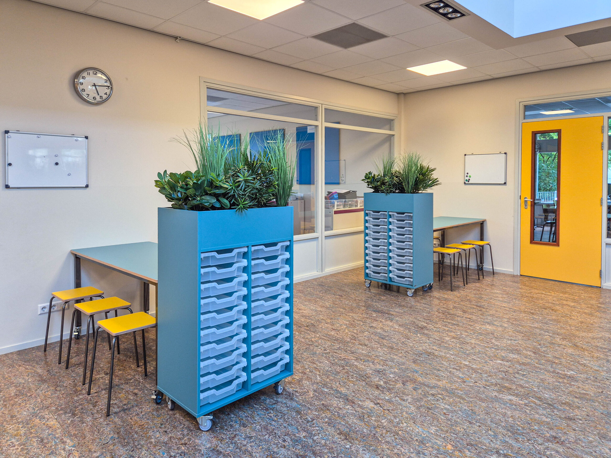 Naast sfeer en uitstraling is er volop aandacht besteed aan functionaliteit. De stevige Sim tafels op wielen en Sam krukken maken de ruimtes flexibel en kindvriendelijk. Met de materiaalkasten met plantenbak op wielen zijn materialen altijd binnen handbereik en eenvoudig te verplaatsen, zodat de ruimtes zich moeiteloos aanpassen aan de activiteiten van de dag. Zo ontstaat een omgeving die niet alleen duurzaam en praktisch is, maar vooral ook een warme en inspirerende plek waar kinderen zich veilig en thuis voelen.