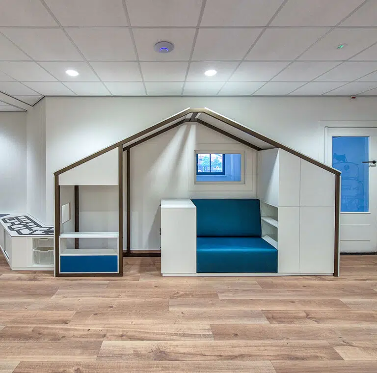 Voor dit kinderdagverblijf hebben we 3 groepen en de verbindende gang mogen inrichten. Hier zie je het eindresultaat van de